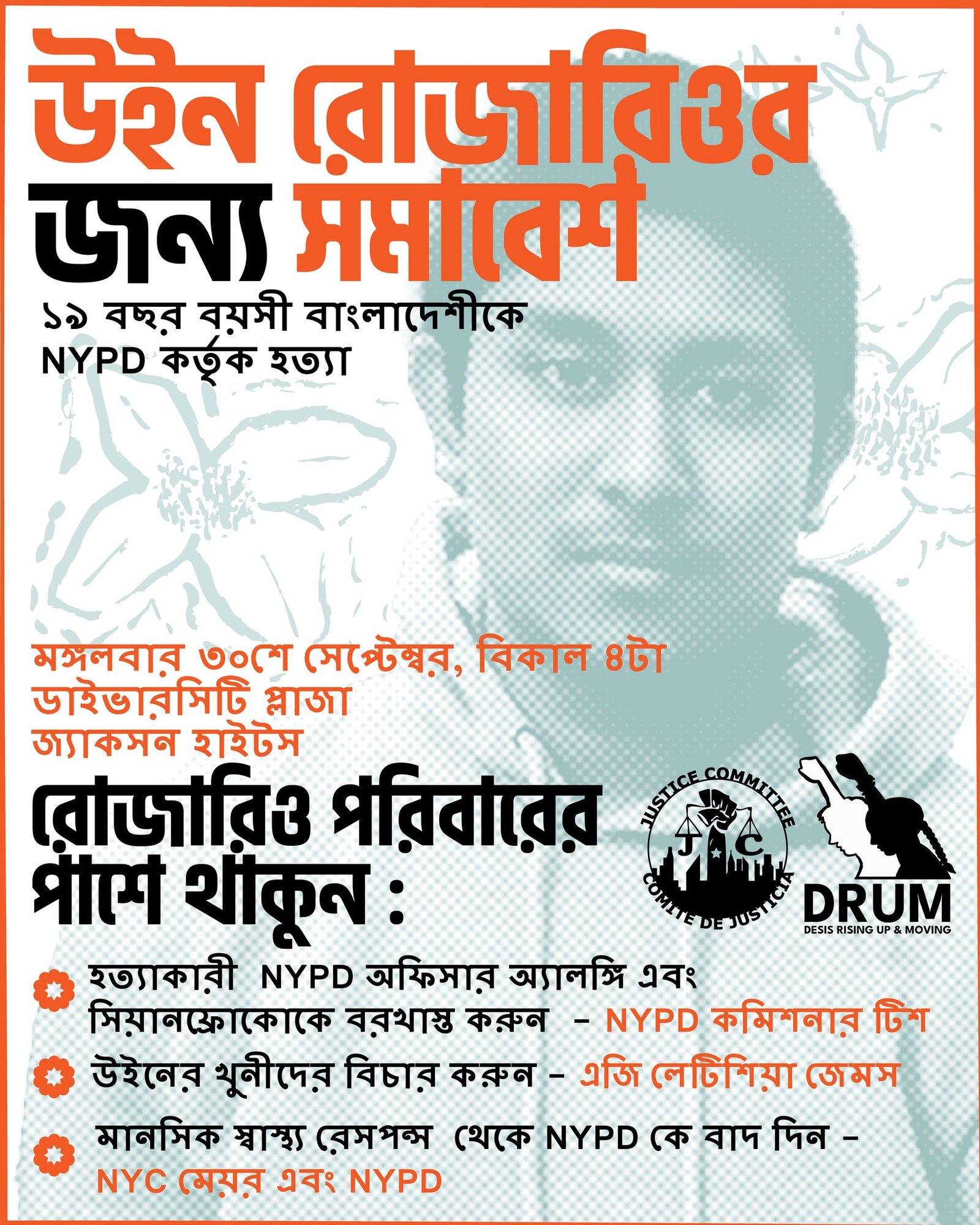 নিউইয়র্ক (ইউএনএ): সিটির ওজনপার্কে ১৯ বছর বয়সী বাংলাদেশী উইন রোজারিওরকে নিউইয়র্ক পুলিশ কর্তৃক হত্যার প্রতিবাদে সমাবেশ হয়েছে। মঙ্গলবার (৩০ সেপ্টেম্বর) বিকেলে জ্যাকসন হাইটসের ডাইভারসিটি প্লাজায় এই সমাবেশ অনুষ্ঠিত হয়। সমাবেশ থেকে রোজারিও পরিবারের পাশে থাকার আহ্বান জানিয়ে হত্যাকারী দুই পুলিশ অফিসার অ্যালঙ্গি এবং সিয়ানফ্রোকোকে বরখাস্তের দাবী জানানো হয়। খবর ইউএনএ’র।
